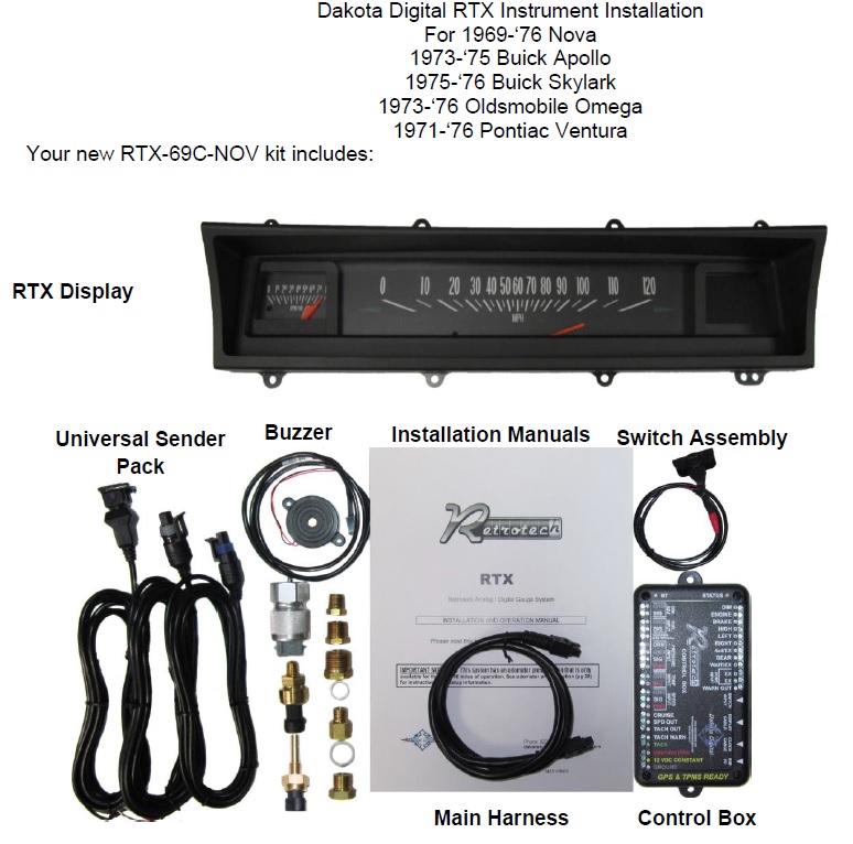 Dakota Digital 1969-76 Chevy Nova, 1973-75 Buick Apollo, 1975-76 Buick Skylark, 1973-76 Olds Omega, and 1971-76 Pontiac Ventura RTX Instruments - RTX-69C-NOV-X