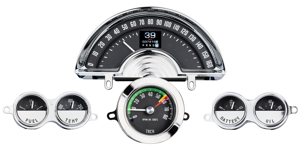 Are you packing your 1958-62 Corvette full of late model tech, but love the look of the stock interior? Maybe you want to retain the original feeling but just want a better instrument system with a bit more accuracy and visibility? Either way, this bolt-in system is just what you need! All new from the chrome bezels to the LED backlighting, they kept all of the cool features of the OEM design and added a full-color TFT message center, LED indicators, precision stepper motor needle movements and of course EFI integration capabilities. Requires stock, cast-metal dash pods (not included) but includes chrome plated billet gauge bezels.
