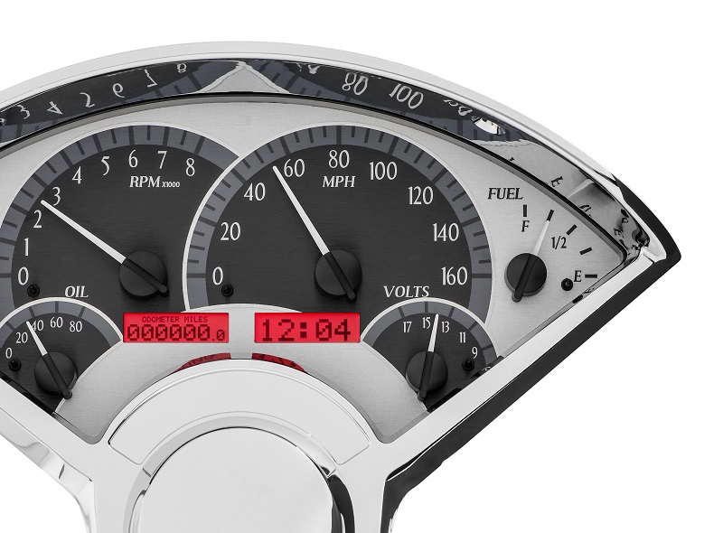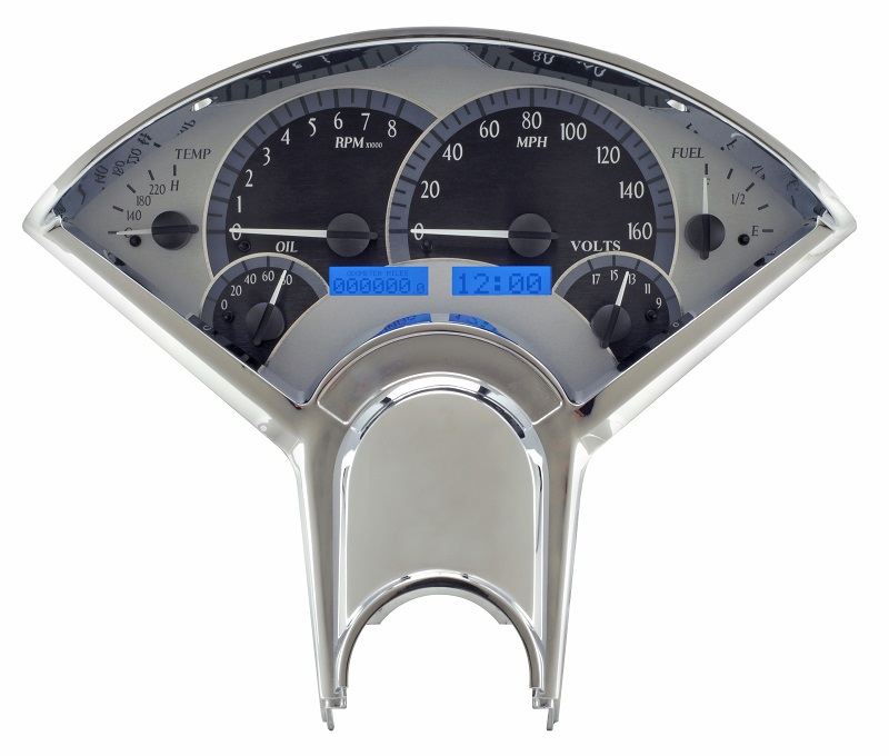 The stock 1955-56 Chevy car dash is lacking in information; VHX-55C makes use of the iconic factory gauge cluster, filling it out with six analog readouts on top of the dual LCD message centers. Able to be used with factory or reproduction bezels (sold separately).
